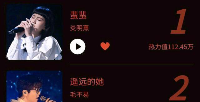 在第一期节目歌曲热力值榜单上,毛不易和炎明熹并驾齐驱,一直霸占着前两名的位置,两人的热力值不相上下,之前一直是毛不易领先炎明熹。