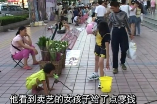 从公园出来,一个在路边卖艺的小女孩引起了高占喜的注意。他看了一会儿,还是掏出了一些零花钱。