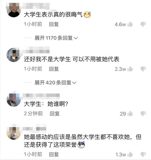 网友也是纷纷评论道,还好我不是大学生,可以不用被她代表,大学生表示很晦气,放过大学生吧,真没有等。看来大学生对刘浩存能获得这个奖,还是有很大的不认同,不然也不能做出如此的发言。