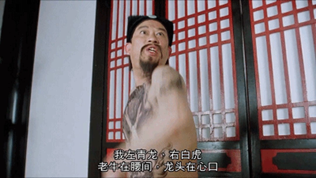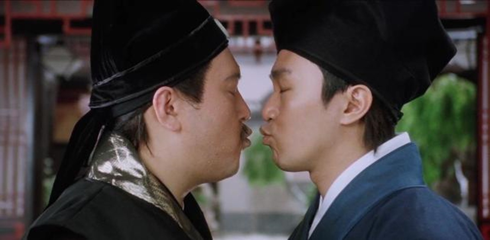 周星驰在这部电影里面的经典场面有很多,其中,与“对穿肠”比对子、惺惺相惜情不自禁接吻的场面,更是经典中的经典。