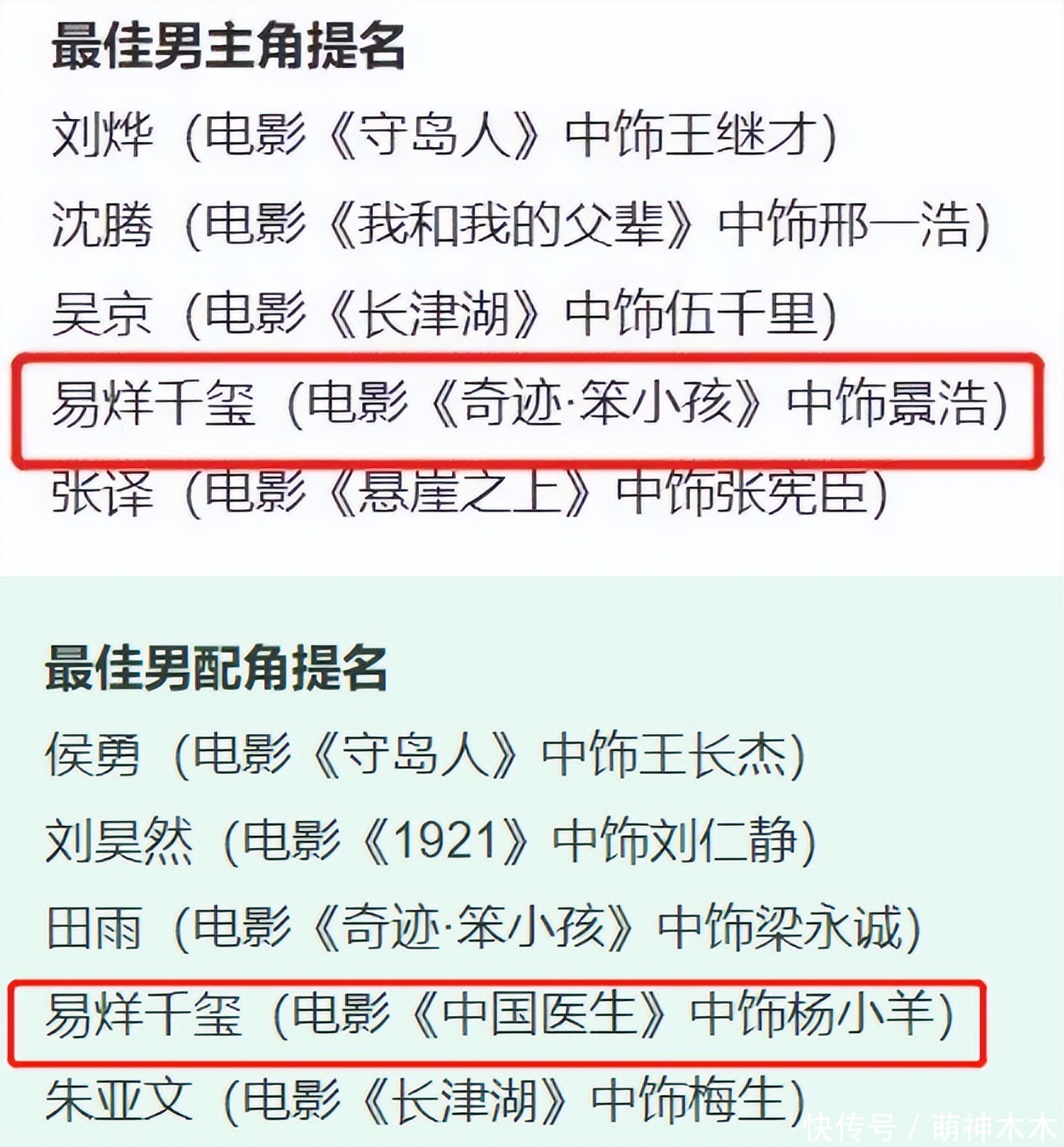 易烊千玺获男主男配双提名,最佳男配遗珠太多