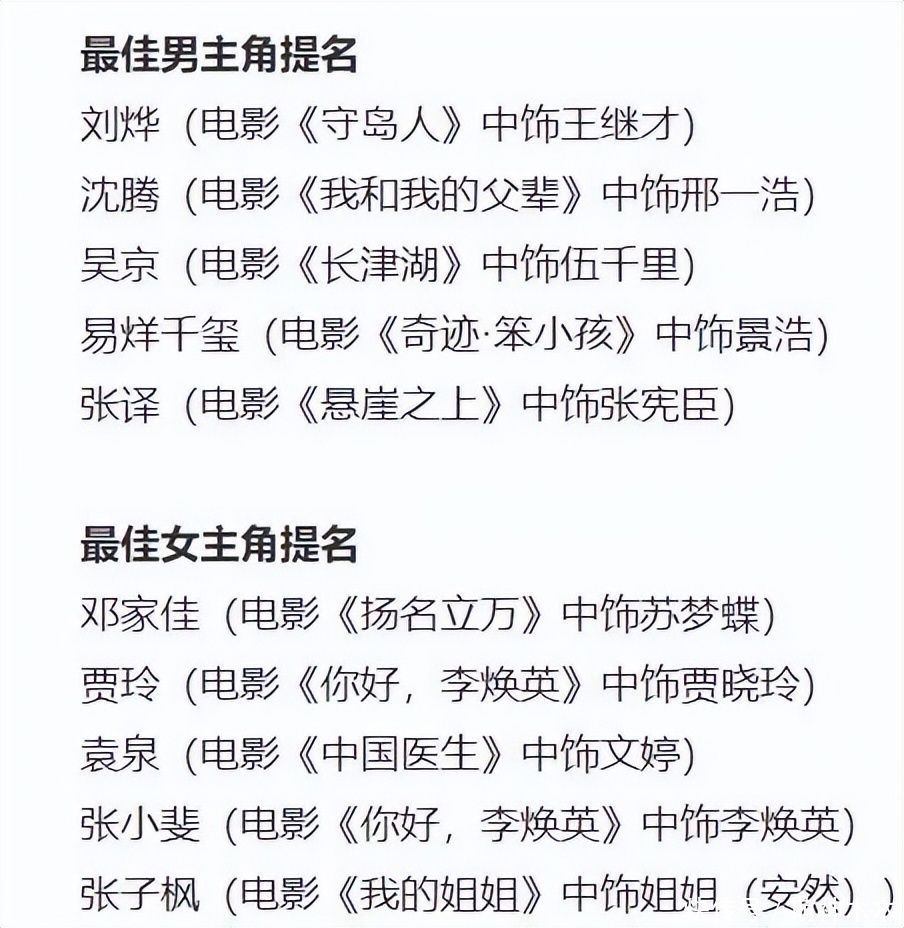 鉴于大家还是比较关心演员奖项,先来看一波最佳男女主角、男女配角的提名情况吧,具体入围名单如图所示。