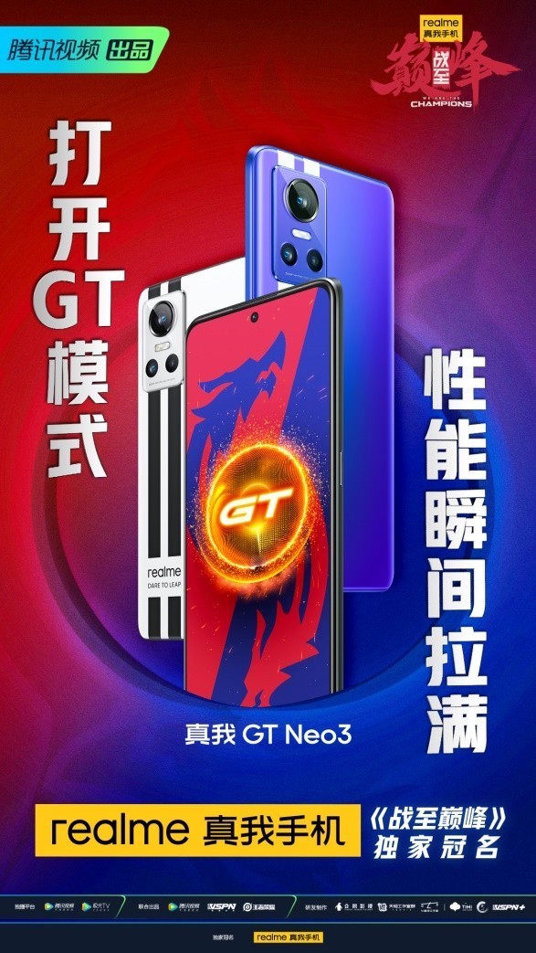 2022年6月11日—中国 · 深圳—科技潮牌真我realme独家冠名的首档王者荣耀电竞综艺《战至巅峰》今日12点在腾讯视频正式首播。潮玩电竞旗舰真我GT Neo3成《战至巅峰》官方指定用机,助阵明星选手纵横峡谷。