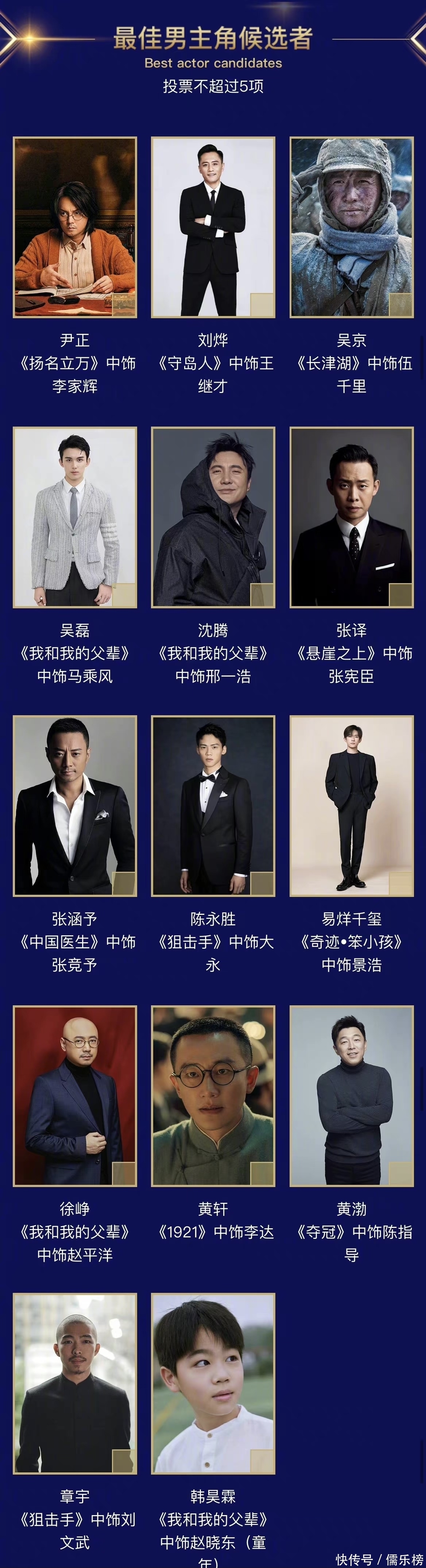 而在这些名单当中,男演员的候选名单特别引人注目,不仅没有一位港澳台同胞,而且内地影视圈的主流演员全在列,像拿了百亿票房演员的就有吴京、沈腾、黄渤三人,而徐峥、张涵予和张译也都是大家熟悉的面孔,像新生军易烊千玺吴磊也是备受大家肯定的演员。