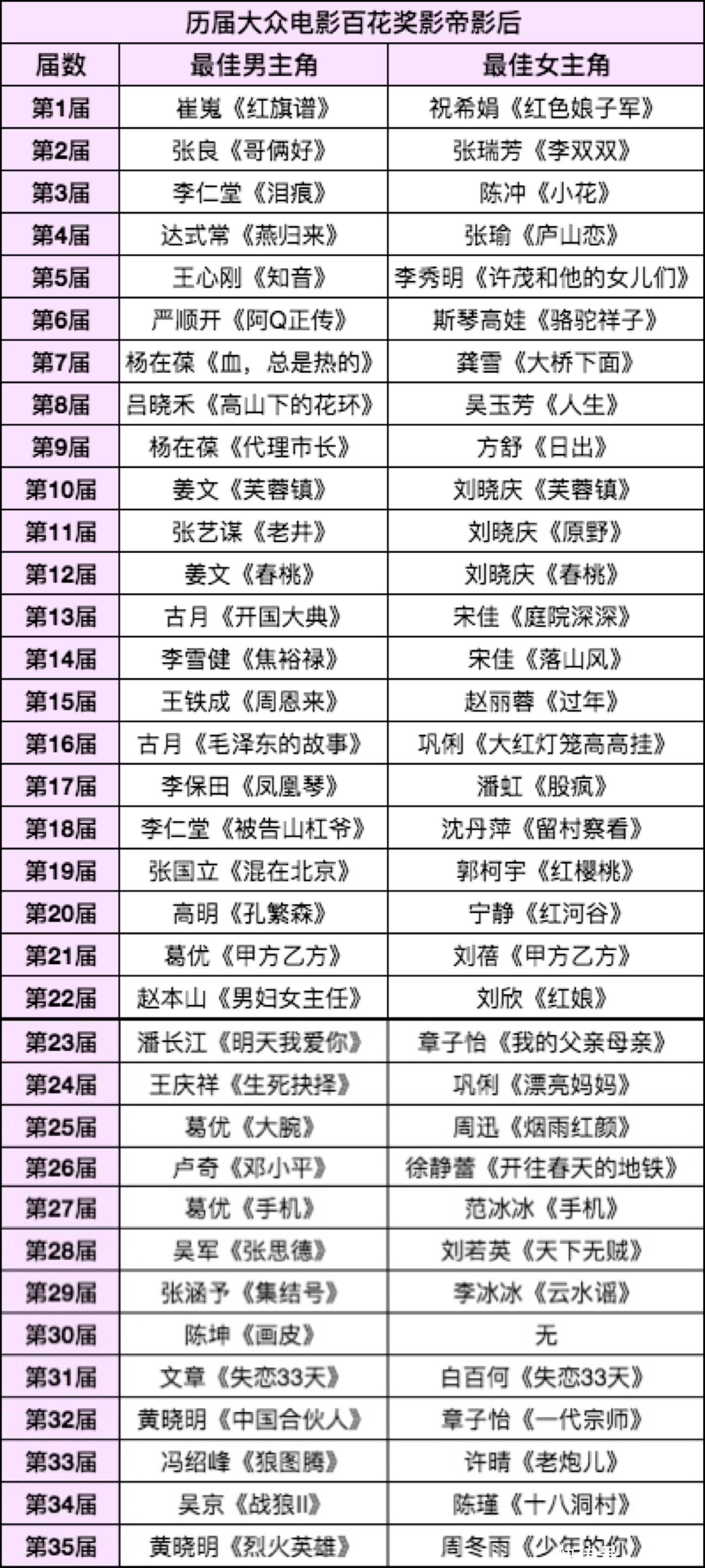 下边儒爷给大家盘点下历届的大众电影百花奖影帝影后,看看你们喜欢的演员有没有在列。