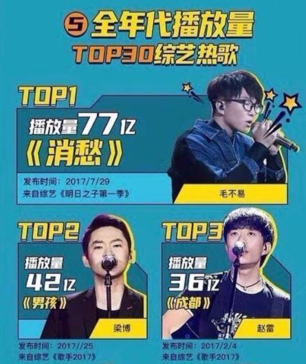 比如《男孩》《出现又离开》《灵魂歌手》《拥有》《日落大道》等金曲,其中《男孩》在音乐平台上获得了42亿播放量,几十万条评论,与毛不易的《消愁》、赵雷的《成都》不相上下。