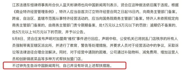 其实最近一段时间,也有媒体再次采访了贤合庄的加盟商,也了解了更多内幕。贤合庄在招募加盟商这方面就已经涉嫌违规操作,本应该先拥有特许经营合同才能继续操作,可贤合庄跳过了这一步骤,两年前就开放加盟。