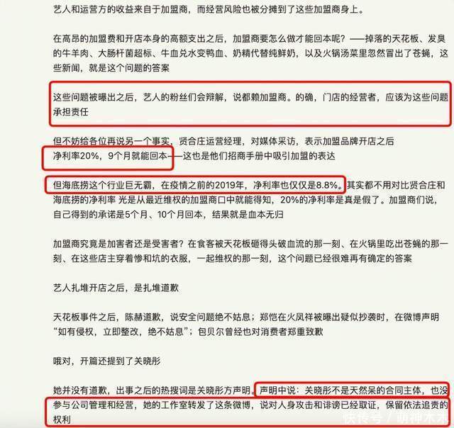 明星跟着赚钱,出事了却赶紧撇清关系,倒霉的可是那些加盟商。餐饮巨头在疫情之前的净利率8.8%,贤合庄却承诺净利率20%,明星效应+画大饼,让加盟商头脑一热直接加盟。出事之后,加盟商钱赔了,而明星呢?只是不痛不痒的一句道歉。值得注意的是,关晓彤连道歉都没有,其父亲占股天然呆35%,关晓彤本人却反咬一口说被人身攻击要取证起诉。