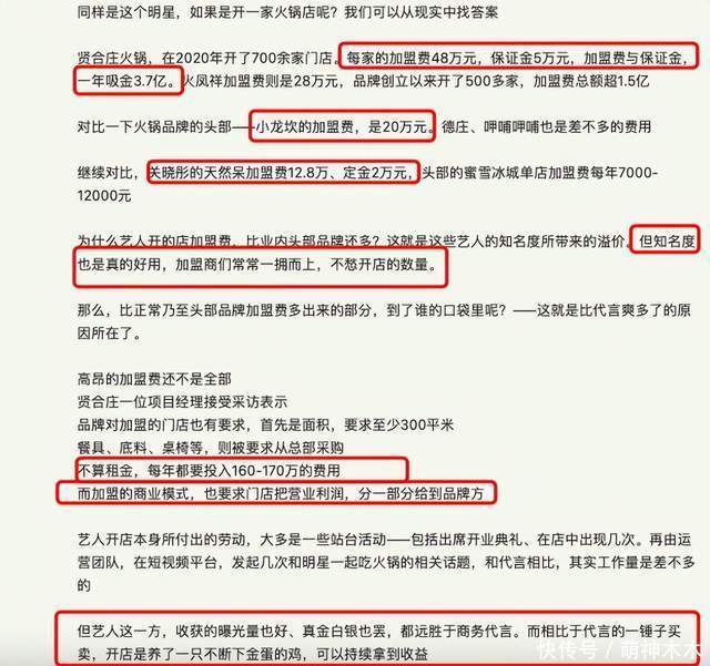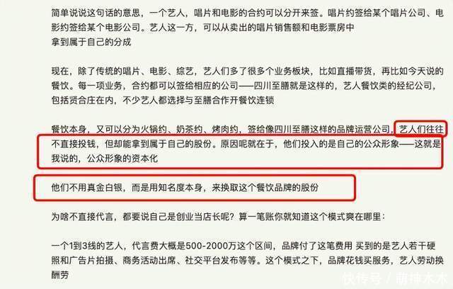 博主举例,艺人在这些餐饮店中不会直接投钱,但是可以直接拿到属于自己的股份,那么不投钱,明星投什么呢?答案就是公众形象,并且已经将其资本化。明星不用真金白银,用知名度就可以换取餐饮品牌的股份。