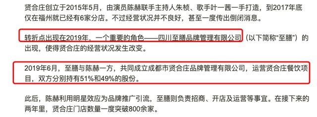 其实这个说法并不太准确,在贤合庄最初成立的时候,由陈赫与朱桢叶一茜联合打造,直到2019年至膳品牌管理有限公司的加入,改变了贤合庄的经营状况,由至膳公司与陈赫再成立一个公司,分别持股51%与49%。