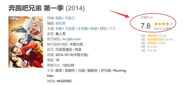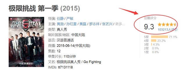 从某评分网站上可以看到,从第一季到第四季,《极限挑战》的评分一直都保持在7.5分以上,最高甚至达到9.3,这个分数在所有综艺节目中是非常少见的,而《奔跑吧兄弟》录制了十季,最高的分数也只有第一季的7.6分,之后就再也没有上过7,可见,《极限挑战》更受大众的喜爱。当然其中导演严敏也是功不可没,如果没有他,可能就没有这档节目了,只可惜严敏随着“极限男人帮”的解体也离开了这档节目,令人十分遗憾。