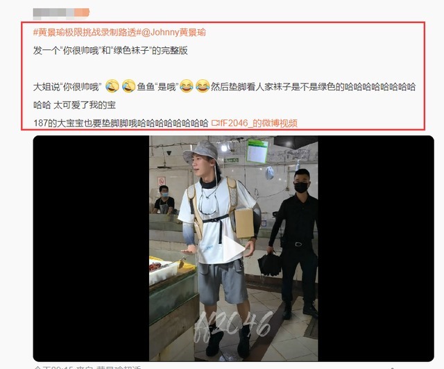 除了龚俊以外,黄景瑜也是娱乐圈内数一数二的男神,无论身材还是样貌丝毫不输任何一位男明星,从网友曝光的视频中可以看到,黄景瑜身穿白色T恤,搭配灰色短裤,头上戴着渔夫帽,在海鲜市场做任务,摊主看到真人后直呼“太帅了”,不过,黄景瑜似乎并没有太过在意,只是一心想完成任务,甚至踮起脚看对方的袜子是不是绿色的,真的是太可爱了。