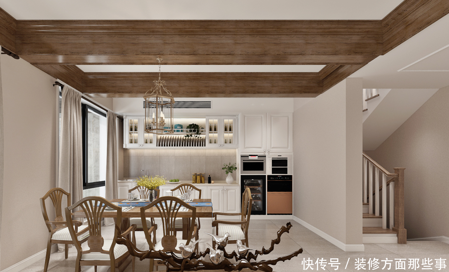 餐厅假梁的吊顶设计将餐厅与客厅进行区分,提升了餐厅空间的档次与层次感,与原木餐桌和餐椅相呼应,深色的原木让空间更加雅致、稳重而不过于浅淡。定制西式餐边柜,烤箱、消毒柜、微波炉嵌入其中,上方玻璃柜门 开放式柜格,满足日常储物需求,又装饰美化了空。
