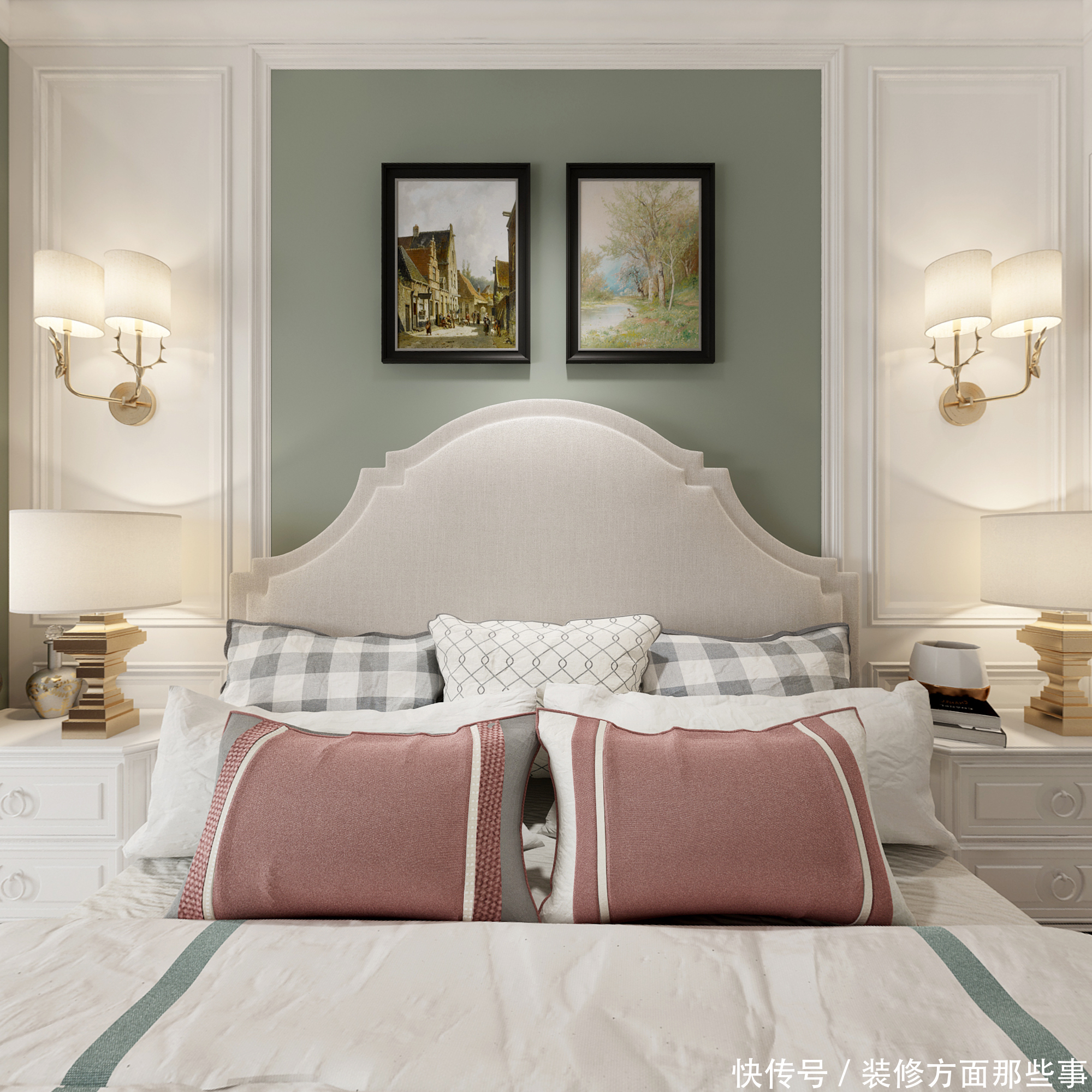 女儿房整体清新的墙面色调,美式背景墙造型设计搭配动漫小镇与山间挂画,局部嫩粉点缀,天真烂漫中带点洒脱的可爱。