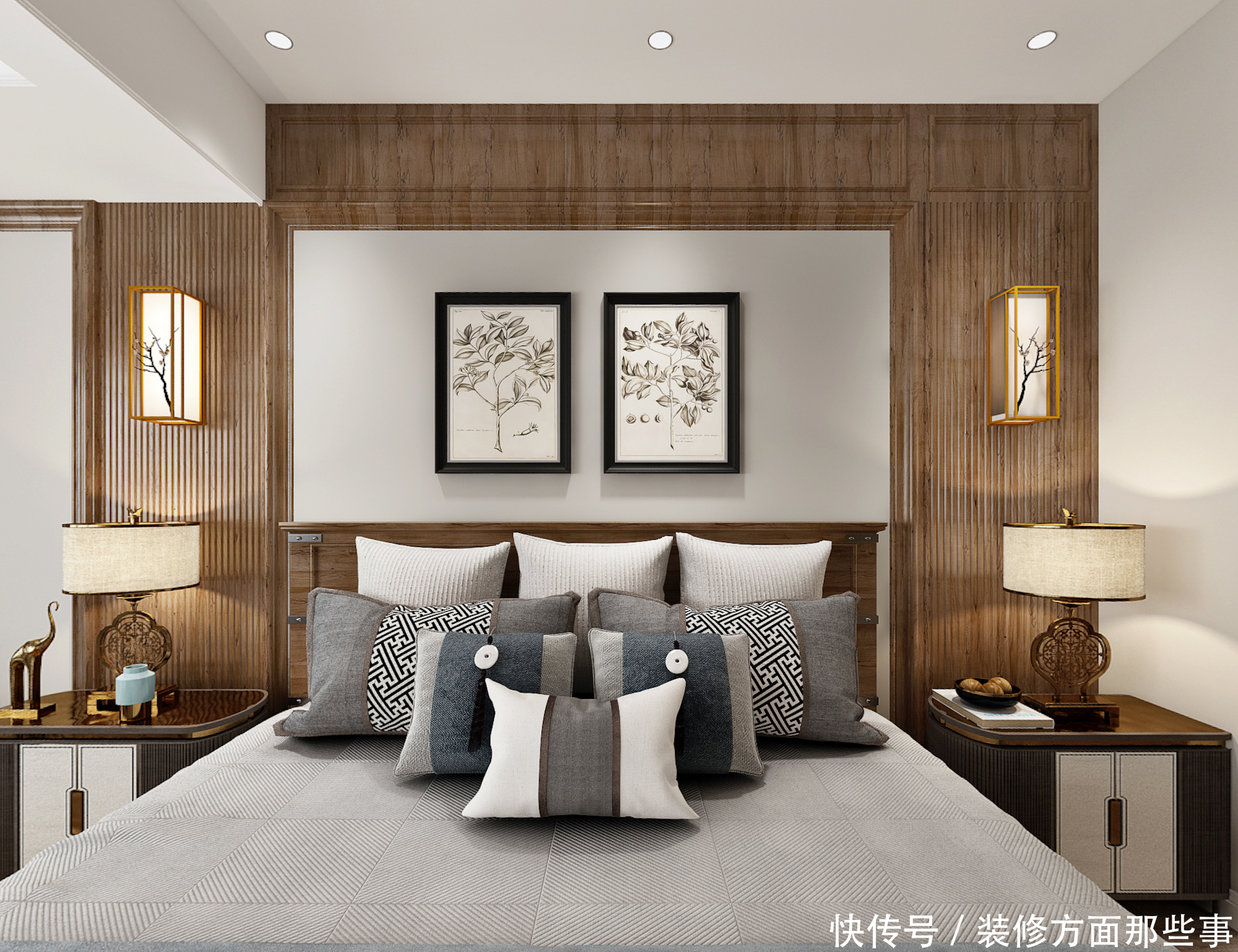 主卧主卧设计风格偏向新中式。木饰面 双福挂画,搭配中式壁灯;大量经典原木定制衣柜,加以经典中式柜门把手设计,构建一个优雅大气、古韵味十足的休憩之所。