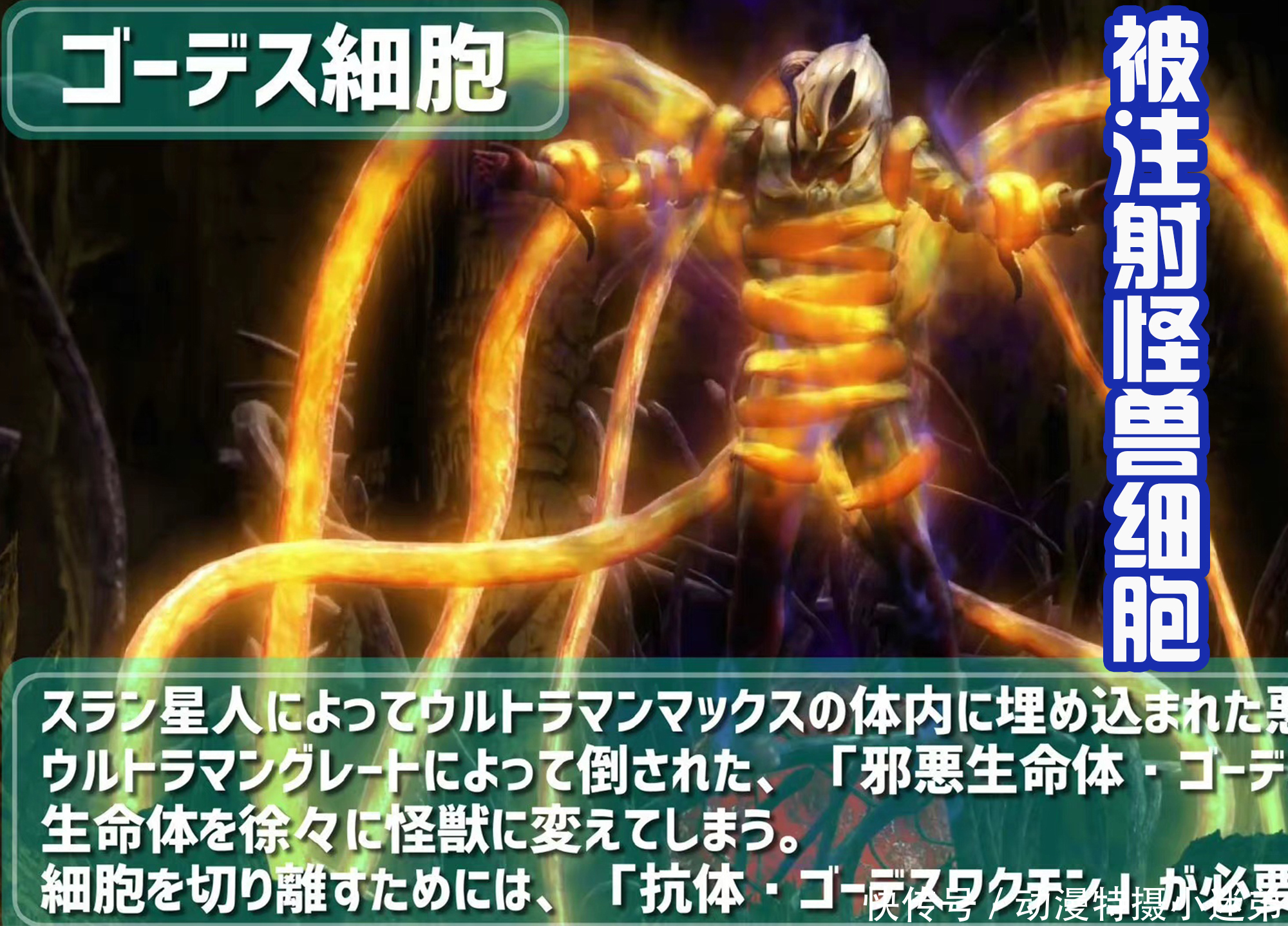 并且被抓住的麦克斯奥特曼被注入戈迪斯细胞,也算是斯兰星人将恶魔细胞埋入麦克斯奥特曼的体内。这是曾经被葛雷打倒的“邪恶生命体戈迪斯”的细胞,可以将生命体逐渐变成怪兽。而能够阻止这一切的,只能够是戈迪斯抗体,这个可以让希卡利奥特曼研究出来。