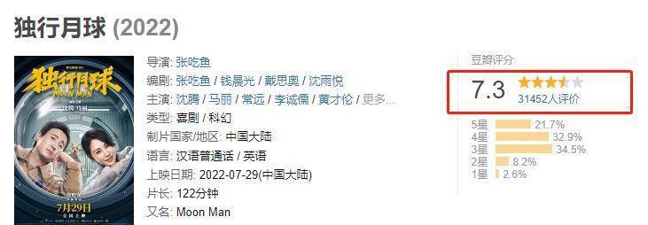 其实,早在开分时,该片就存在着不少差评,而且观众打差评的理由大致上都差不多。那就是《独行月球》虽然打着科幻喜剧,并且有着沈腾和马丽这两位喜剧演员的加盟。但其实该片的笑点非常低,更有网友吐槽该片的剧情就像是大学时期晚会的小品一样。