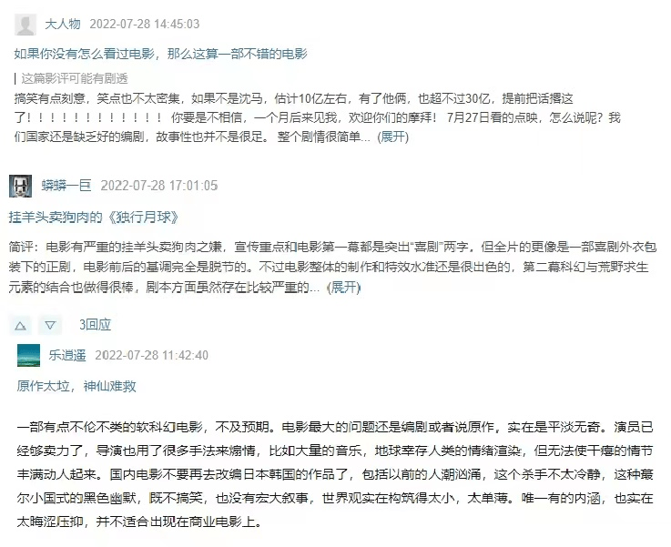 虽然不可否认,但该片内容太过单薄,的确是个不争的事实。据了解,《独行月球》翻拍自韩国漫画,原作世界观构筑太小,若作为漫画来看设定新颖,但翻拍成两个小时的电影,就很容易造成故事性的不足。