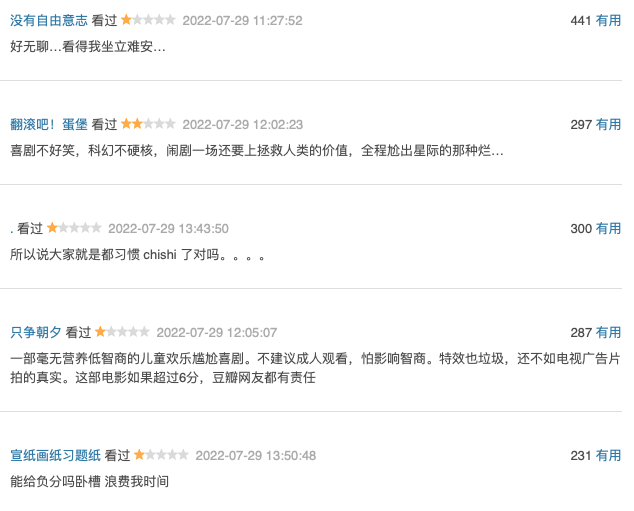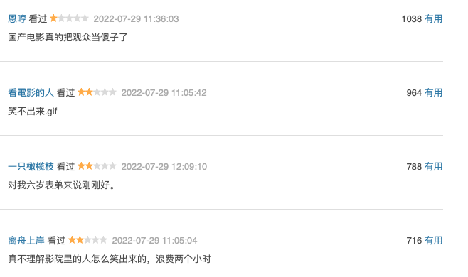 可能大家觉得这些评论只有千人点赞,可能是有人专心黑,但对有几万人打分却上千人点赞,其实,这比例也并不低了。而且众人给差评的理由全都差不多,这也表明,很大可能方片的确有着笑点低以及内容拼凑的嫌疑。